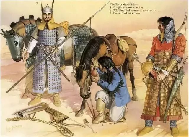 突厥人是起因于中国西北至中亚一带的一个游牧民族。他们直到公元5世纪中期还附于当时的草原霸主柔然,成了负责制作金属器具的“锻奴”,积累了强大的冶铁技术。到了六世纪,突厥开始日益强盛起来,消灭了昔日的主人柔然,成为新一代的草原霸主。此时中原还处于东西魏分立割据的时代,双方不但无力对草原上的突厥人的征战进行干预,还慑于新兴突厥汗国强大的军事实力,均采取向突厥纳贡、和亲的政策,以换取突厥人的支持。这使得突厥人得到了绝佳的发展时机。经过多年的征战,突厥人建立了东起中国东北辽河流域,西至中亚的庞大帝国。疆域之广,甚至使得突厥人可以与欧洲的东罗马帝国组成军事联盟,共同对抗西亚的萨珊波斯帝国。势力范围之广,纵观中国历史上那样多游牧民族,也只是仅次于蒙古人而已。