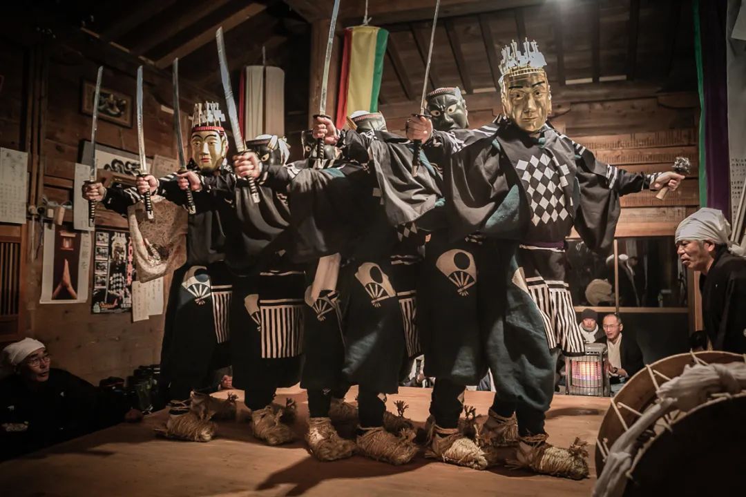 谷内村落的五大尊舞。据说是蜻蜓长者夫妇与四名家臣的舞蹈。他们头上戴着梵天冠和面具,右手分别拿着大刀。
