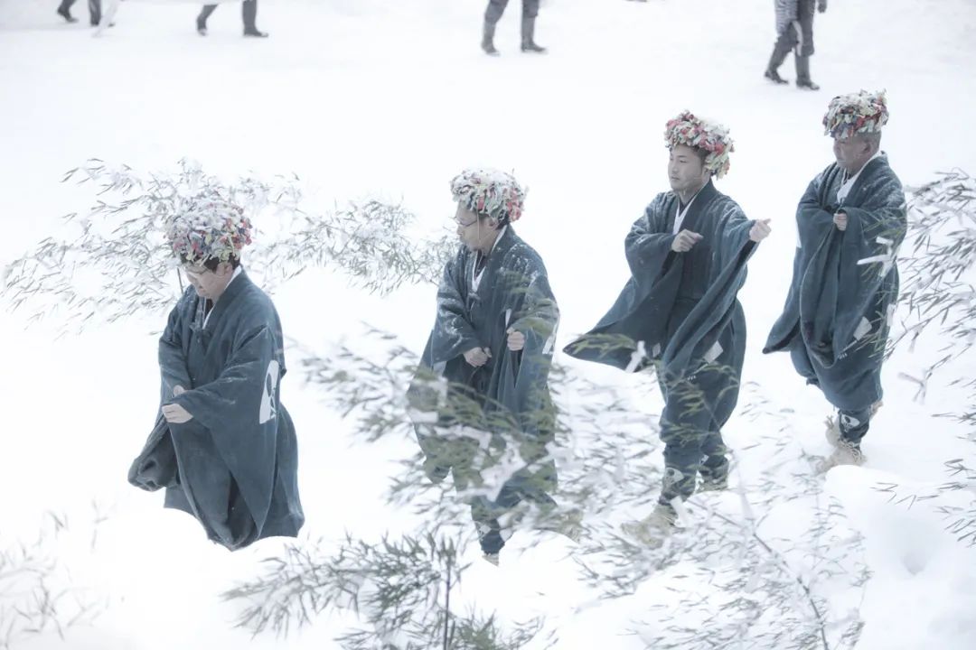 能乐舞者在祭祀之前需要进行非常严格的斋戒。斋戒时间最长的需要48天时间。斋戒中也要在夜里用冷水浇淋,清洗身体,这种修行叫水垢离,这即便是对年轻人来说也是异常艰辛的事情。拍摄这张照片的时候,正赶上大雪天,天气太差,根本看不清前面的状况。进行这种祭祀活动的四个村落里,现在只有一个村落还在进行水垢离这种修行。