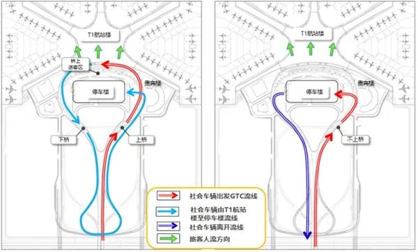 到达旅客:旅客可经航站楼二层或B1层连廊前往停车楼,使用反向寻车设备或反向寻车二维码查询车辆位置,取车后按流线离场。