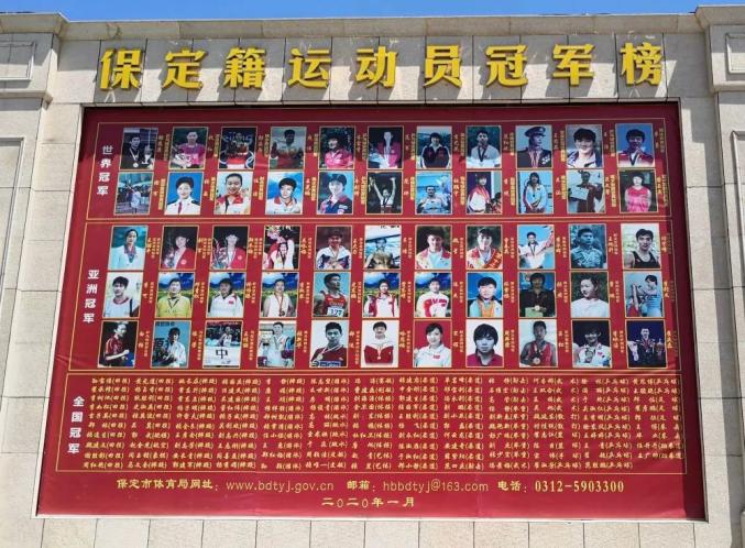 保定市体育局门口的“冠军墙”上,贴满了保定籍冠军的照片,它被保定人亲切地称为“英雄谱”,记录着保定体育人的光荣与梦想。“跳水女皇”郭晶晶、“水蝴蝶”钱红、射击大满贯庞伟等都榜上有名。