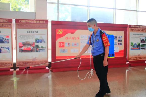 ▲凭祥站党员农世仙对凭祥站候车室进行全面消毒。