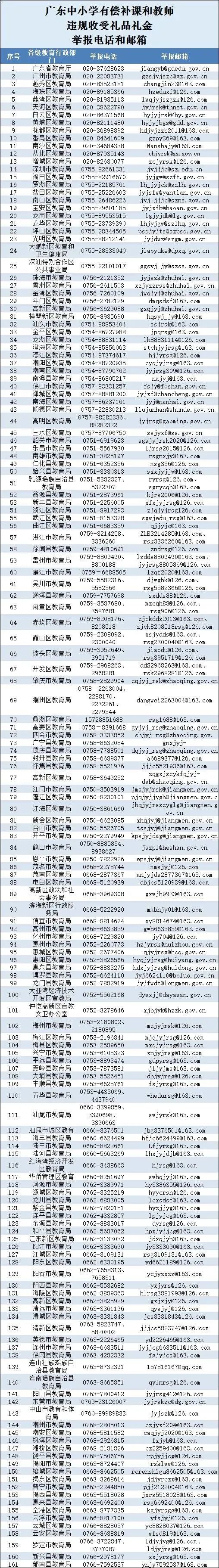 8月11日,广东省教育厅公布了中小学有偿补课和教师违规收受礼品礼金举报电话和邮箱,全省161个教育部门举报联系方式随之公开。