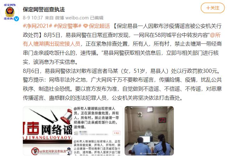 河北省保定市易县网警获取相关信息后,立即与相关部门进行核实,该消息为不实信息。8月6日,易县网警依法对散布谣言者马某(女,51岁,易县人)处以行政罚款300元。