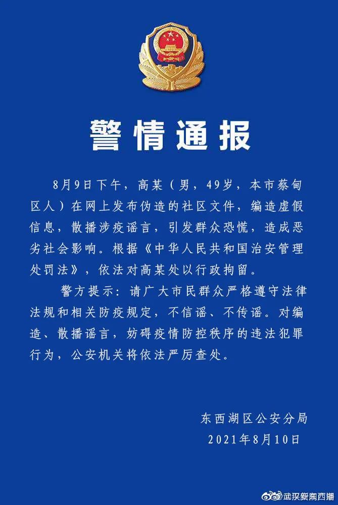 8月10日晚间,湖北当阳草埠湖派出所通报此信息为虚假信息。8月10日14时许,草埠湖派出所接辖区群众报警后立即接警,并与疫情防控部门取得联系。当日17时许,草埠湖派出所民警将发布此虚假疫情信息的杨某抓获,根据《中华人民共和国治安管理处罚法》之规定,公安机关依法给予其行政拘留3日的处罚。(温璐、郝孟佳、实习生冷佩遥)