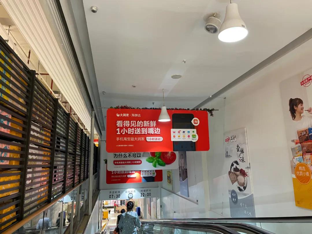 跟“新人”家乐福相比,大润发是淘鲜达上的“老人”。离家乐福不远的一家大润发里,到处悬挂着“一小时达”的红色广告标语,店门口是清一色的蓝色大润发淘鲜达专属配送团队。