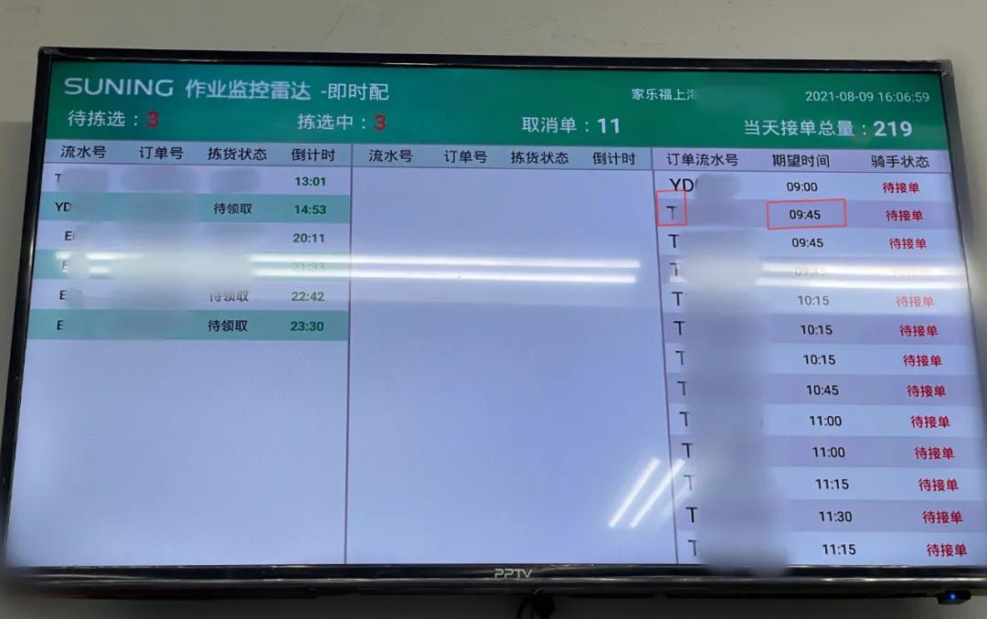 8月初的某个工作日16点,《IT时报》记者来到上海南部一家家乐福超市的到家服务拣货仓库,墙上的屏幕中滚动苏宁作业监控雷达信息,左侧是待拣选单,来自饿了么、美团、苏宁易购和淘鲜达,右侧是待接订单,除了一单之外,全是淘鲜达,最早的一单期望送达时间为9:45。