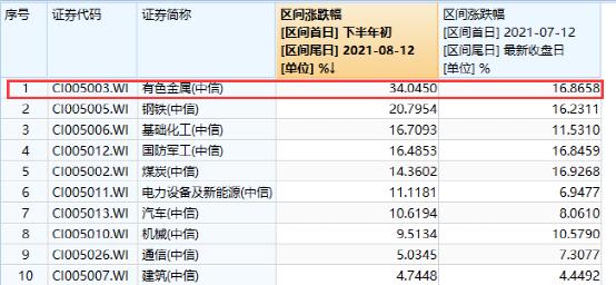 近期有色金属板块表现强势,截至8月12日,下半年以来有色金属指数大涨34.05%,位居30个中信一级行业指数榜首。