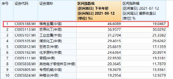 而在中信二级行业指数中,稀有金属指数一个多月以来大涨46.61%,显示出更大的板块弹性。