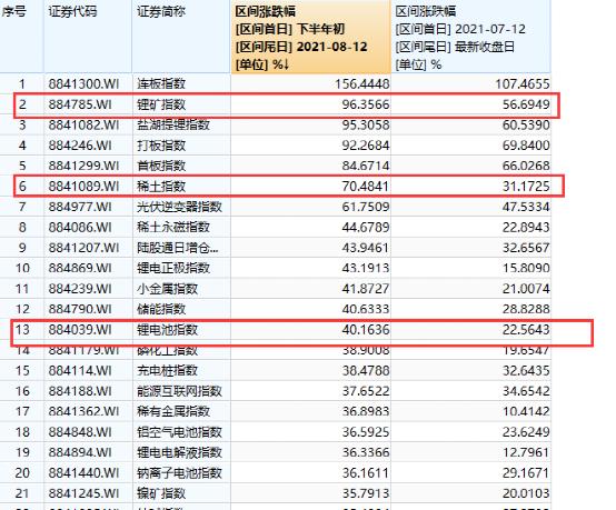 稀有金属板块的权重板块主要为稀土和锂。其中万得稀土指数下半年以来涨幅达70.48%,锂矿指数同期涨幅高达9成以上,而同期两市最火热的锂电池板块涨幅40.16%,新能源涨幅23.79%。