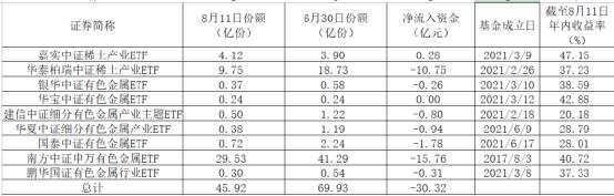 按照区间成交均价统计,整体约有30亿元资金净流出。其中南方中证申万有色金属ETF份额减少11.76亿份,净流出资金超15亿元。