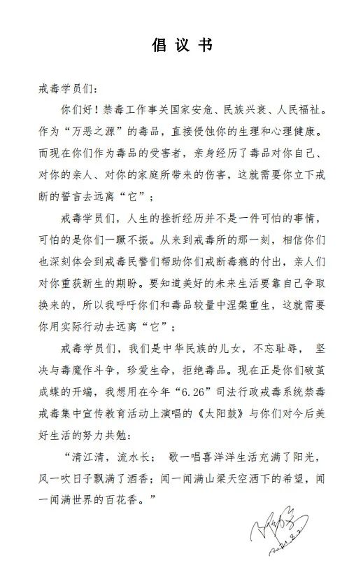 戒毒人员收到了“倡议书”纷纷表示,一定服从民警管理,安心接受戒治,争取早日回归家庭的怀抱。