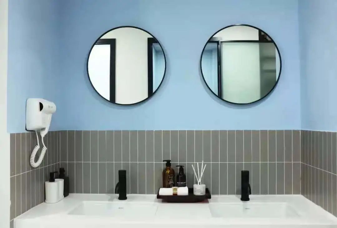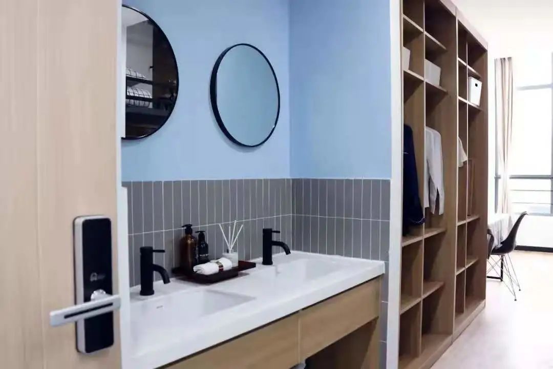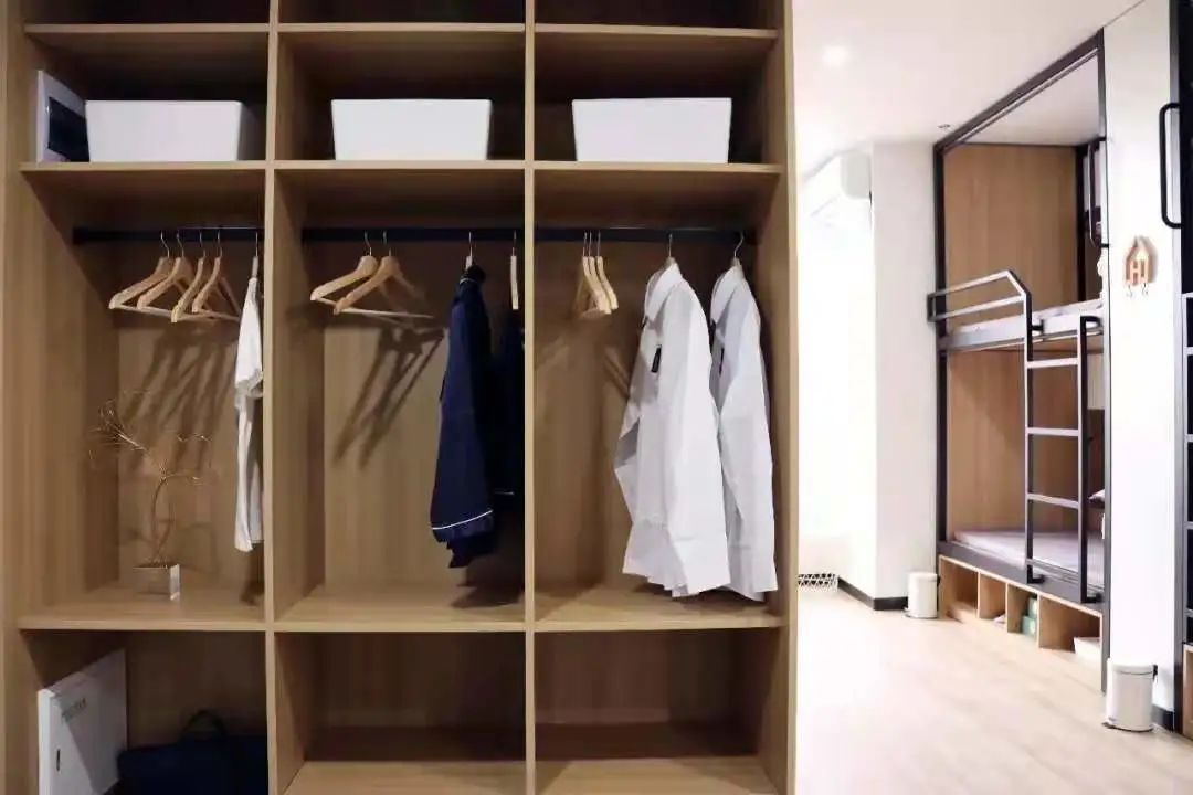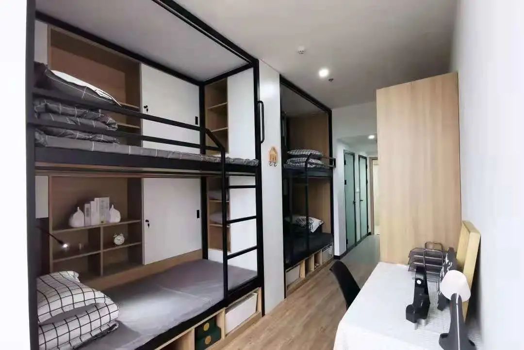 这间建筑面积25.7平方米的四人间,一边是双人洗手台和四人衣柜,另一边是上下铺四张床和干湿分离的卫生间。尽管空间不大,但黑白灰的主色调看起来简洁雅致,除了每人一列的衣柜,上下铺周围也设计了大小不一的收纳空间,可以当衣柜、书架、储物装饰,也有带锁的柜门,供存放个人物品。