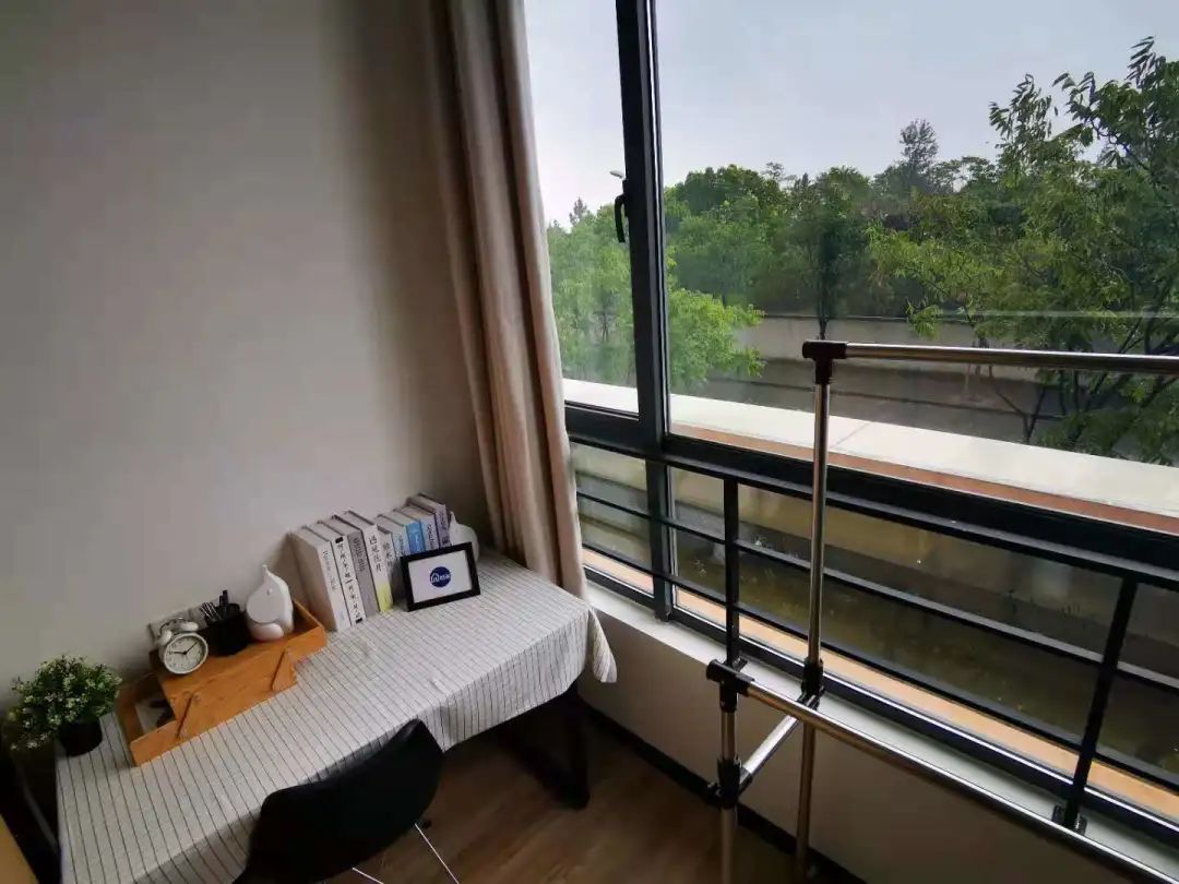 床铺一侧的阅读灯设置颇为贴心,下方就有插座,电子产品充电十分方便。上下铺底层也设计了开放格,可以收纳鞋子、脸盆等日用品。屋内靠窗一侧设置有晾衣架,另一边还隐藏了一个小书桌,满足日常生活所需。“四人间是我们这次宿舍型公租房的主力房源,占比大概在80%左右,有49套。”“盛华景苑”宿舍型公租房项目负责人叶正告诉记者。