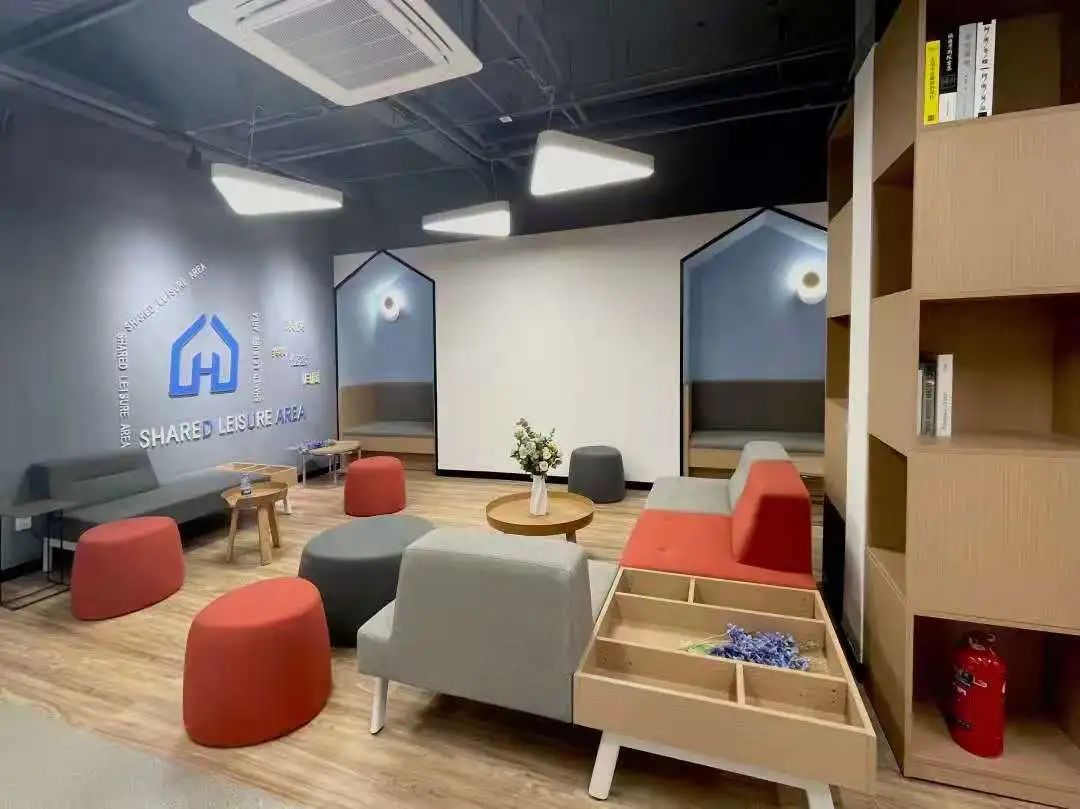 而走出宿舍,公用厨房、公共餐厅、洗烘一体的洗衣房,会客厅、书吧等共享空间更是一应俱全,一站式提供就餐、洗衣、文化休闲及娱乐社交功能。考虑到集体宿舍的公共性,为保护隐私,也尽量减少对室友的打扰,楼道里还贴心地设置了一个私人电话亭,为有需要的租客提供一处安静的私密空间。