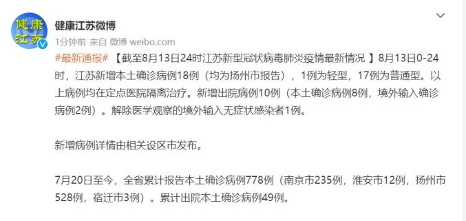 江苏卫健委刚刚通报,8月13日0-24时,江苏新增本土确诊病例18例(均为扬州市报告)。