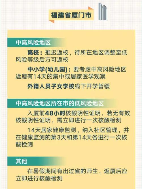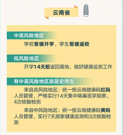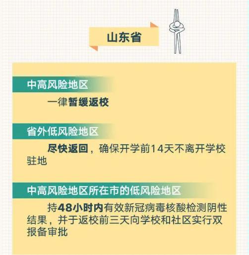 重庆:经专家研判,疫情总体形势可控,重庆市学校具备如期正常开学的条件。中小学(含中职)按校历9月1日开学行课,幼儿园和特殊教育学校参照执行。高校原则上按既定时间8月27日—9月6日陆续错峰开学,个别高校可根据实际情况调整。2021级新生按照学校录取通知书通知的报到时间报到。若全国、全市疫情发生重大变化,将根据疫情形势、上级要求、专家研判及时做出调整并进行全市统一调度。