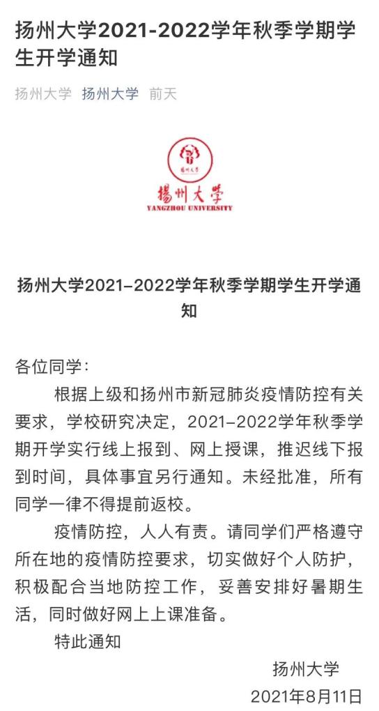 8月11日,扬州大学发布2021-2022学年秋季学期学生开学通知,明确开学实行线上报到、网上授课,推迟线下报到时间。未经批准,所有同学一律不得提前返校。