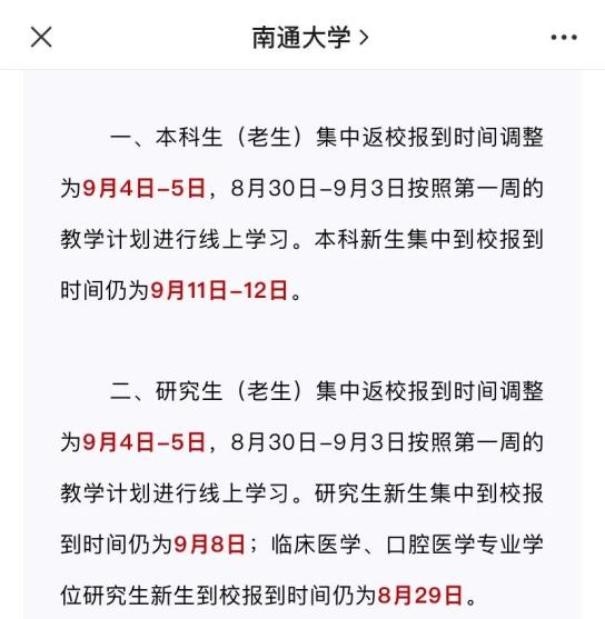 此外,南通大学也对学生返校时间进行调整,并明确按照第一周的教学计划进行线上授课。