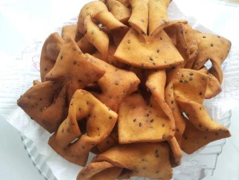 擀好的面皮,外婆接过摊开,用菜刀修去边幅,先裁成长条,再裁成三寸左右的长方块。对折后,在中间剪几个口子,像穿花似的将皮子一头穿进去扭成棱式花样,即民间所谓“七曲八弯”之形,一排排摆到大盘子里。