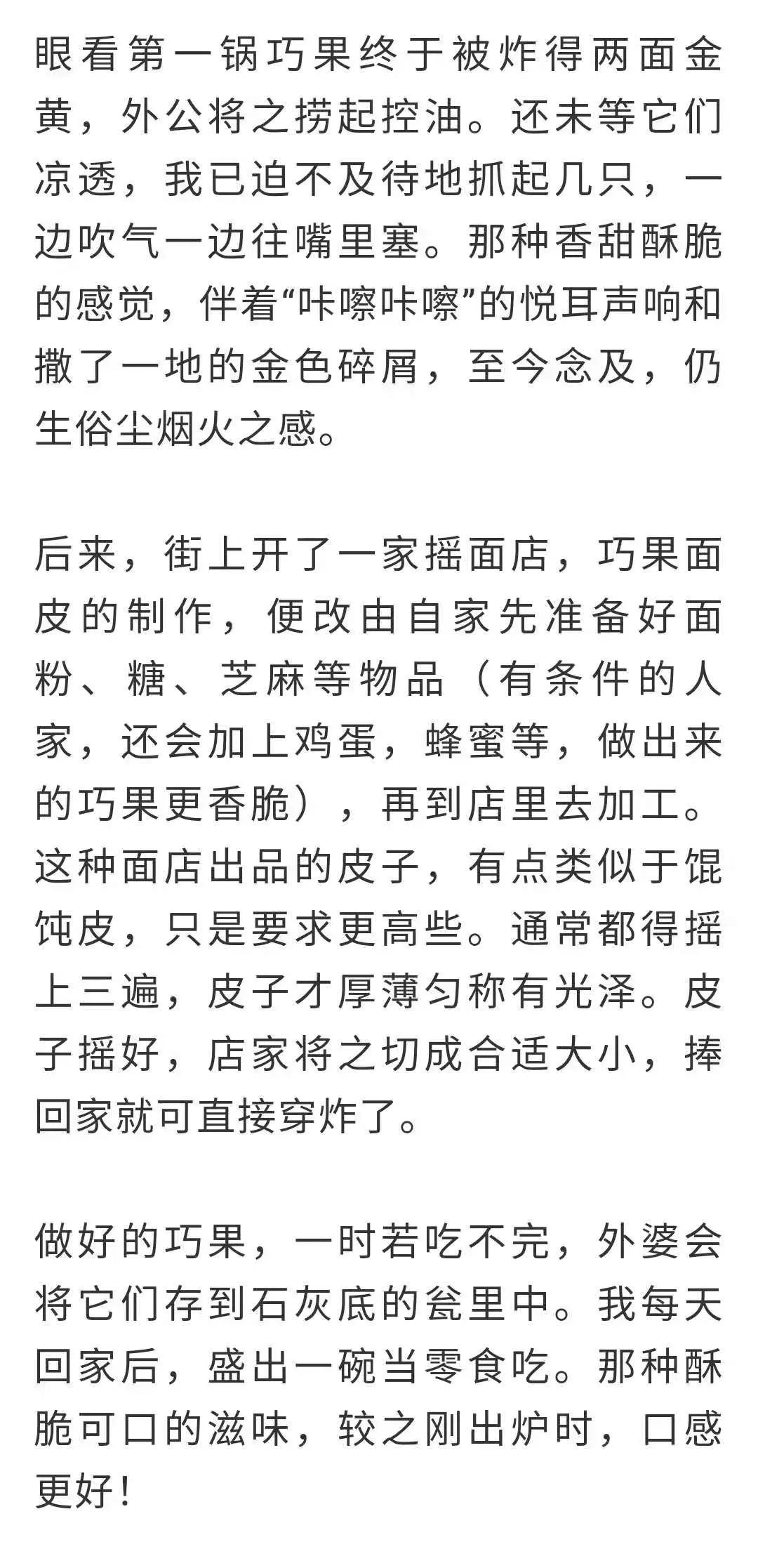 早已候在一旁的外公,此时已往大锅中倒好了新菜油,烧热后,陆续放入穿好的巧果生胚,并用一双长筷,来回拨弄。巧果遇热油涨发,一只只在锅里载浮载沉,灶间的空气中随即弥漫起一股扑鼻的食香,馋得我兴奋在锅旁团团打转,片刻不愿离开。想想也是,在饼干还算稀罕物,很少舍得买的年代里,这油汪汪既酥且脆的巧果,对孩子的诱惑力会有多大!