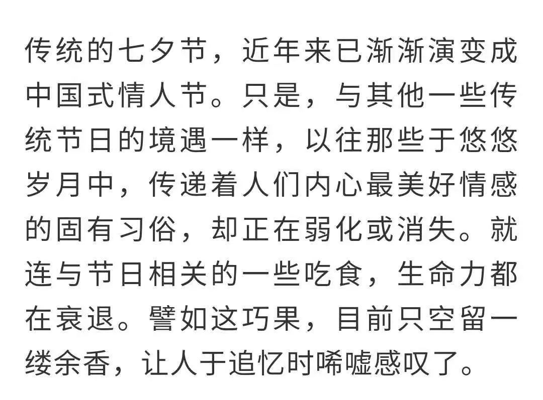 早年时,每到七夕前夕,不管有多忙,家里都要挤出时间来做巧果,而在经济条件拮据的当时,能吃上面粉做、油里炸的巧果,绝对是桩快乐且隆重的事。亦因此,于我印象中,这一天的全家老少,脸上都是笑嘻嘻的。