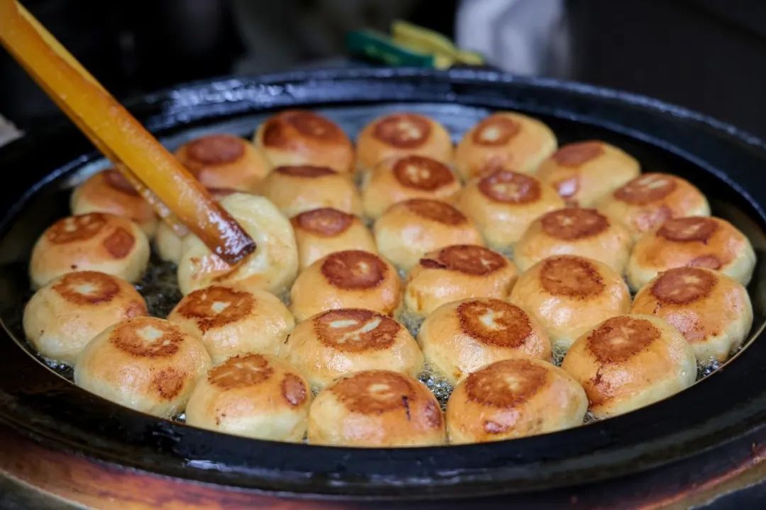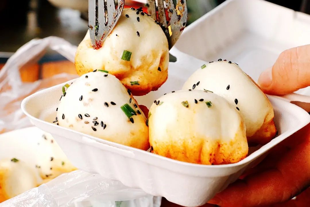 水煎包皮薄馅儿大,每个都有2两重,一面煎至金黄就能出锅。其中猪肉馅的水煎包最受欢迎,咬上一口汁水横流,如果喜欢吃素,推荐韭菜鸡蛋粉条馅儿的,若是还不满足,山东杂粮煎饼也可以来上一套。