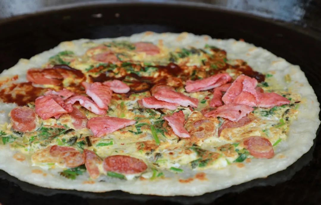 薄薄一张饼皮包罗万象,各式各样的辅料赋予了这张饼丰富的味道和口感。咬一口香气四溢,肉糜的香味在舌尖滚动的感觉,让这一天都元气满满!