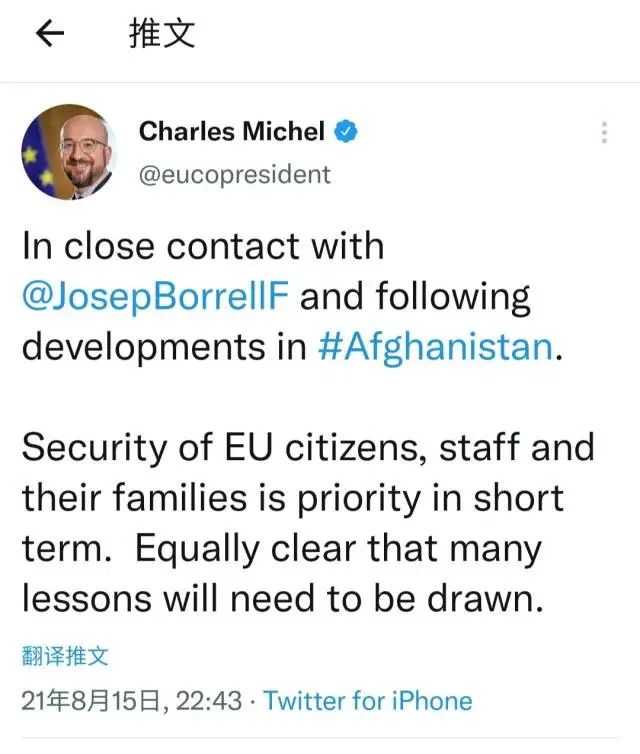 米歇尔说,短期而言,欧盟公民、工作人员及其家属的安全是优先事项,同样明确的是“需要吸取多重教训”。