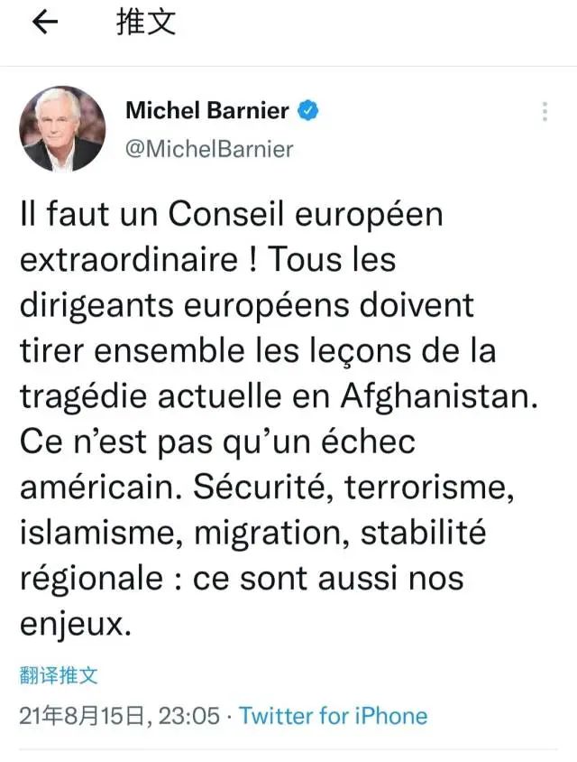 同一天,曾担任过欧盟委员会副主席以及英国“脱欧”事务欧盟首席谈判代表等职的法国政治家巴尼耶也在社交媒体上表示,所有欧洲领导人都必须共同吸取当前阿富汗悲剧的教训。(阿富汗悲剧)不仅仅是美国的失败,也给欧洲在安全和移民等问题上带来多重挑战。巴尼耶还建议欧盟召开特别峰会,聚焦阿富汗问题。