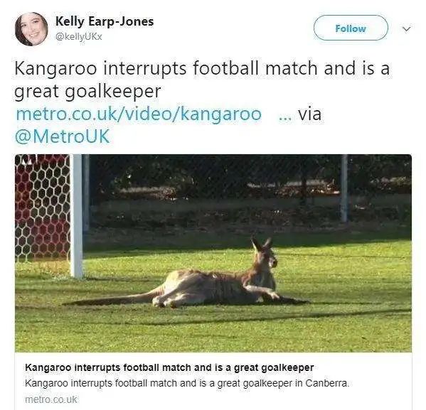 △“袋鼠闯入正在比赛的足球场,竟是一个极棒的守门员!”