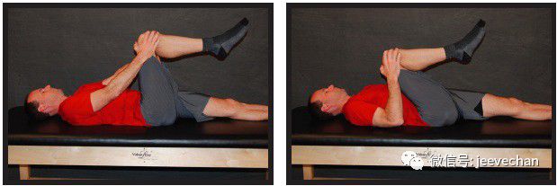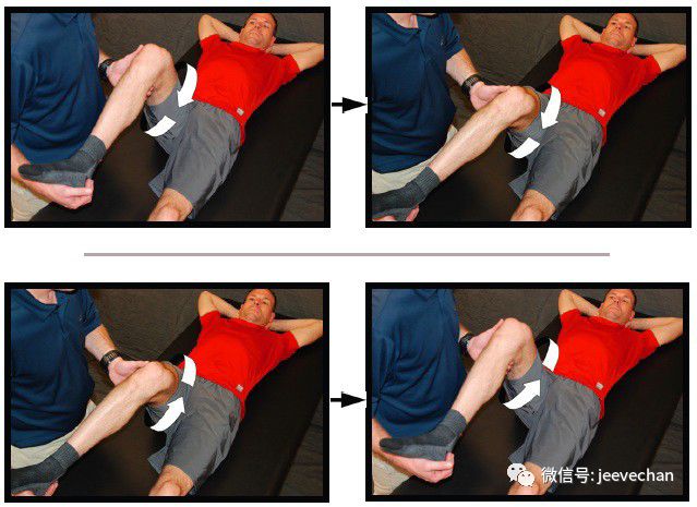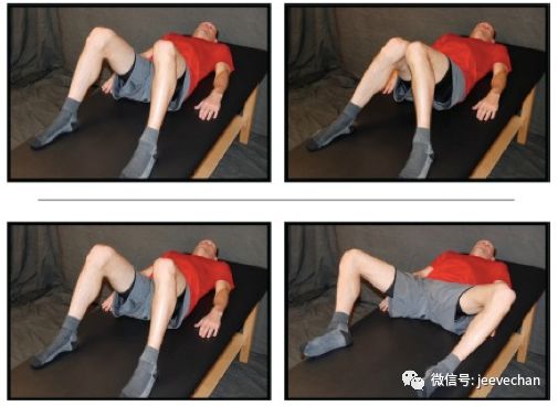 ❶ 仰卧,屈膝45°,屈髋约45°,让理疗师或家人缓慢向外旋转足部以使髋内旋