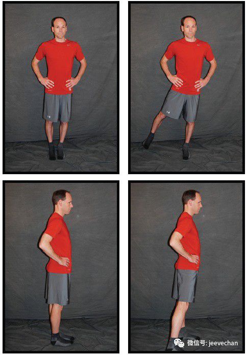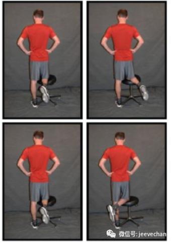 ❶ 重心放在健侧腿上同时保持患侧腿伸直,将腿稍微旋转至内旋位(脚尖向内)