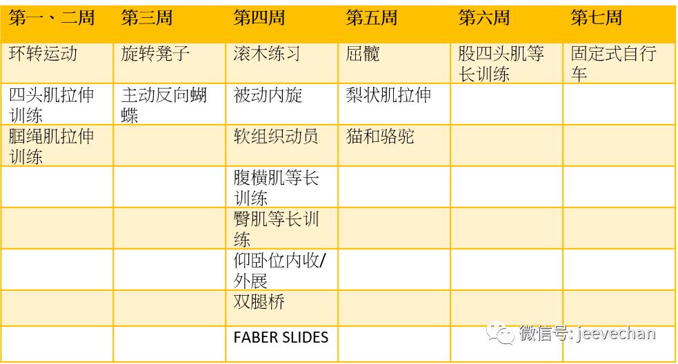 以下小编很简单地弄了一个表,整理了术后7周可以做哪些训练。各位对照上面的内容练起来吧!