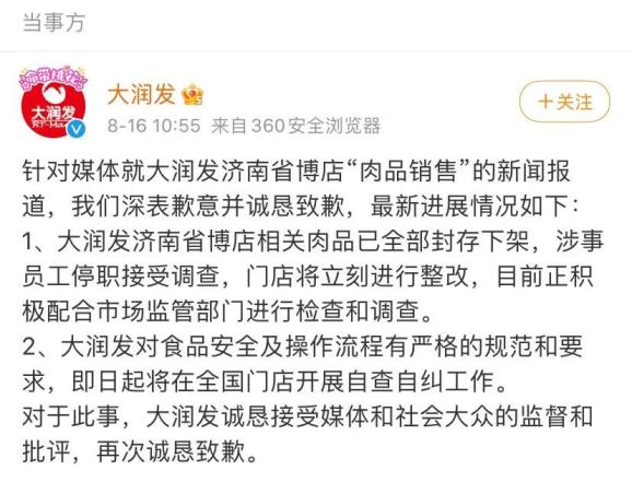 上午10时,@大润发 官微对此发文公开道歉,表示相关肉品已全部封存下架,涉事员工停职接受调查,门店将立刻进行整改。