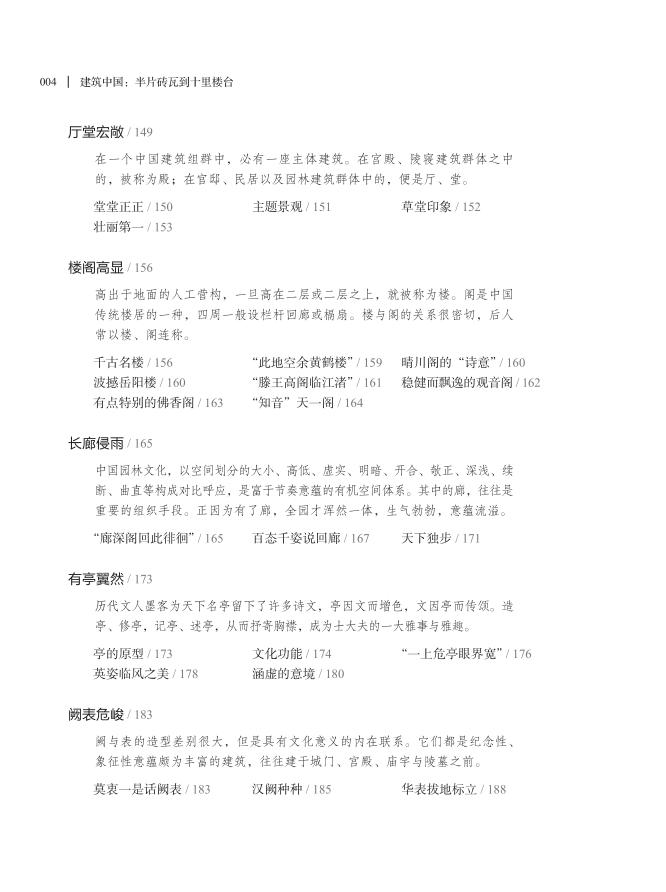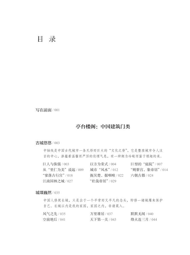 本书包括两个部分:亭台楼阁,指中国建筑的基本门类;雕梁画栋,指建筑个体的基本构成。就像书名所象喻的,从极细微的构件,到一座城的营构,有关中国建筑的一切,就说得八九不离十了。有一副对子说得好:“琼楼玉宇,皆得天地灵气;雕梁画栋,都为鬼斧神工。”