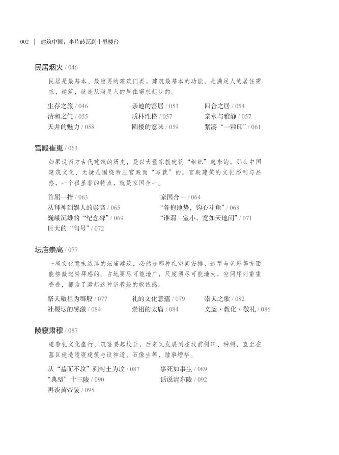 1. 本书分别从建筑门类和构件角度,举凡中国建筑各类型,均囊括在内,条分缕析,从技术而艺术而文化,全面观照中国建筑。