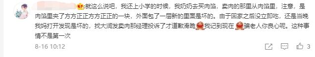 还有网友表示,自家在大润发买的肉馅,外面一层新鲜肉馅,里面全是坏的肉馅。