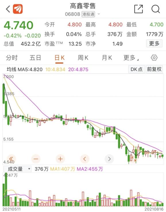 16日早盘,大润发母公司高鑫零售的股价瞬间高台跳水,截至收盘,报收4.74港元/股。
