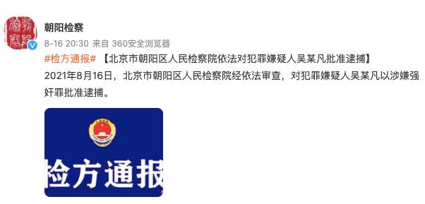 16日晚,据北京市朝阳区人民检察院官方微博发布通报 ,2021年8月16日,北京市朝阳区人民检察院经依法审查,对犯罪嫌疑人吴某凡以涉嫌强奸罪批准逮捕。