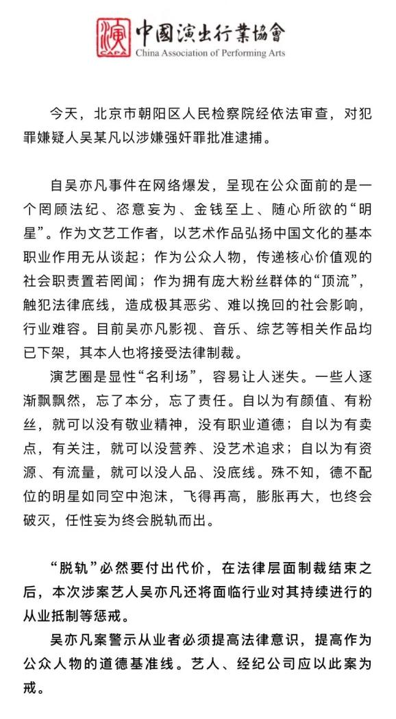 中国演出行业协会发文《“脱轨”的代价》。文章称,“‘脱轨’必然要付出代价,在法律层面制裁结束之后,本次涉案艺人吴亦凡还将面临行业对其持续进行的从业抵制等惩戒。吴亦凡案警示从业者必须提高法律意识,提高作为公众人物的道德基准线。艺人、经纪公司应以此案为戒。”