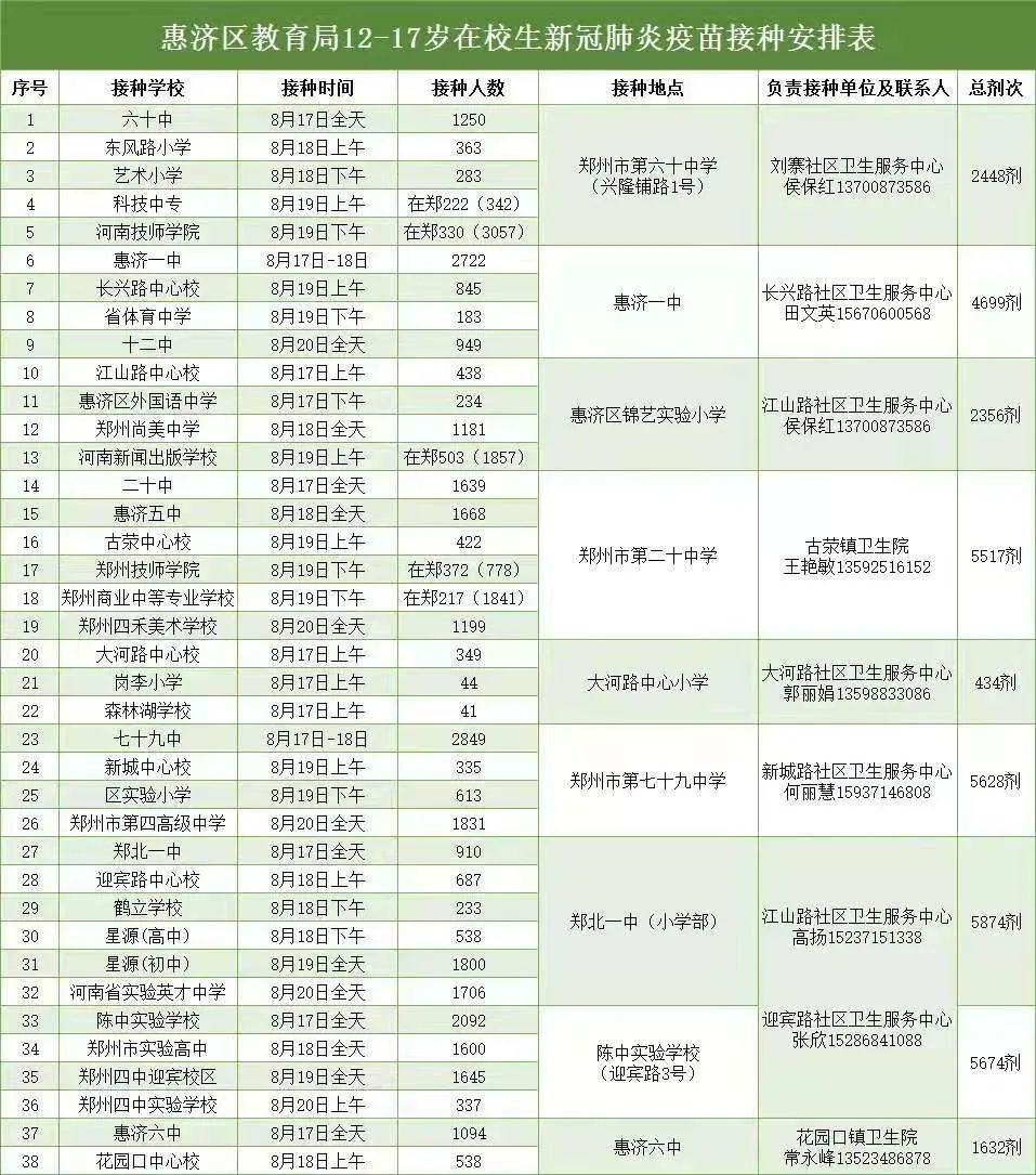 接种时间:8月17-20日,上午8:30-12:00 、下午2:00-7:00;8月23-24日,上午8:30-12:00、下午2:00-7:00。详见>>惠济区12-17岁在校学生疫苗接种安排来了!8月19日,郑州高新区启动12-17周岁学生新冠肺炎疫苗接种工作。