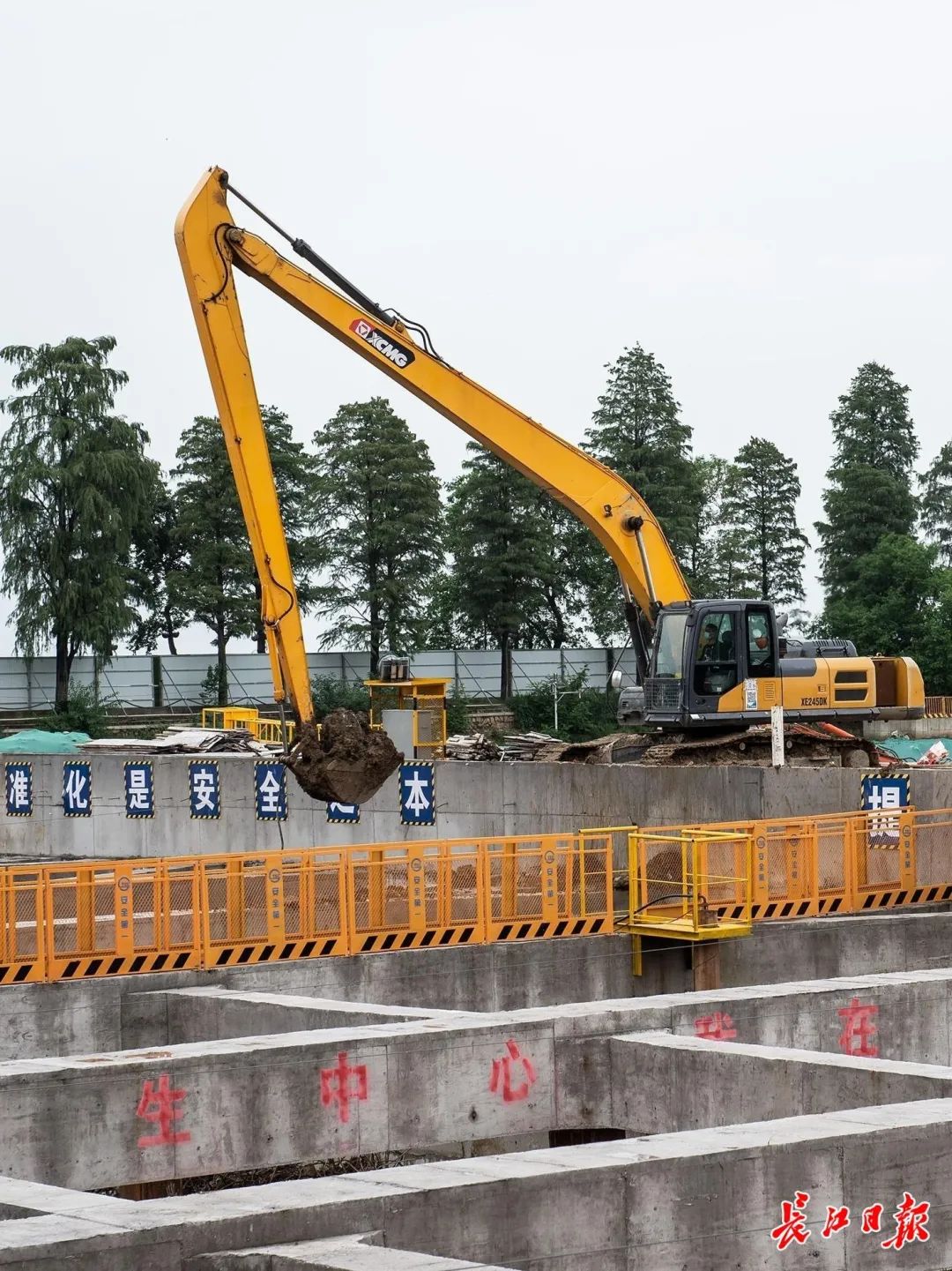 8月16日,位于汉阳芳草路的武汉地铁12号线港口村站,一台大型悬挖钻机正在往地下钻孔,进行桩基施工;旁边一台履带吊车正在吊装一个超长钢筋笼,将它吊入另一个已经打好的钻洞,准备浇筑混凝土。