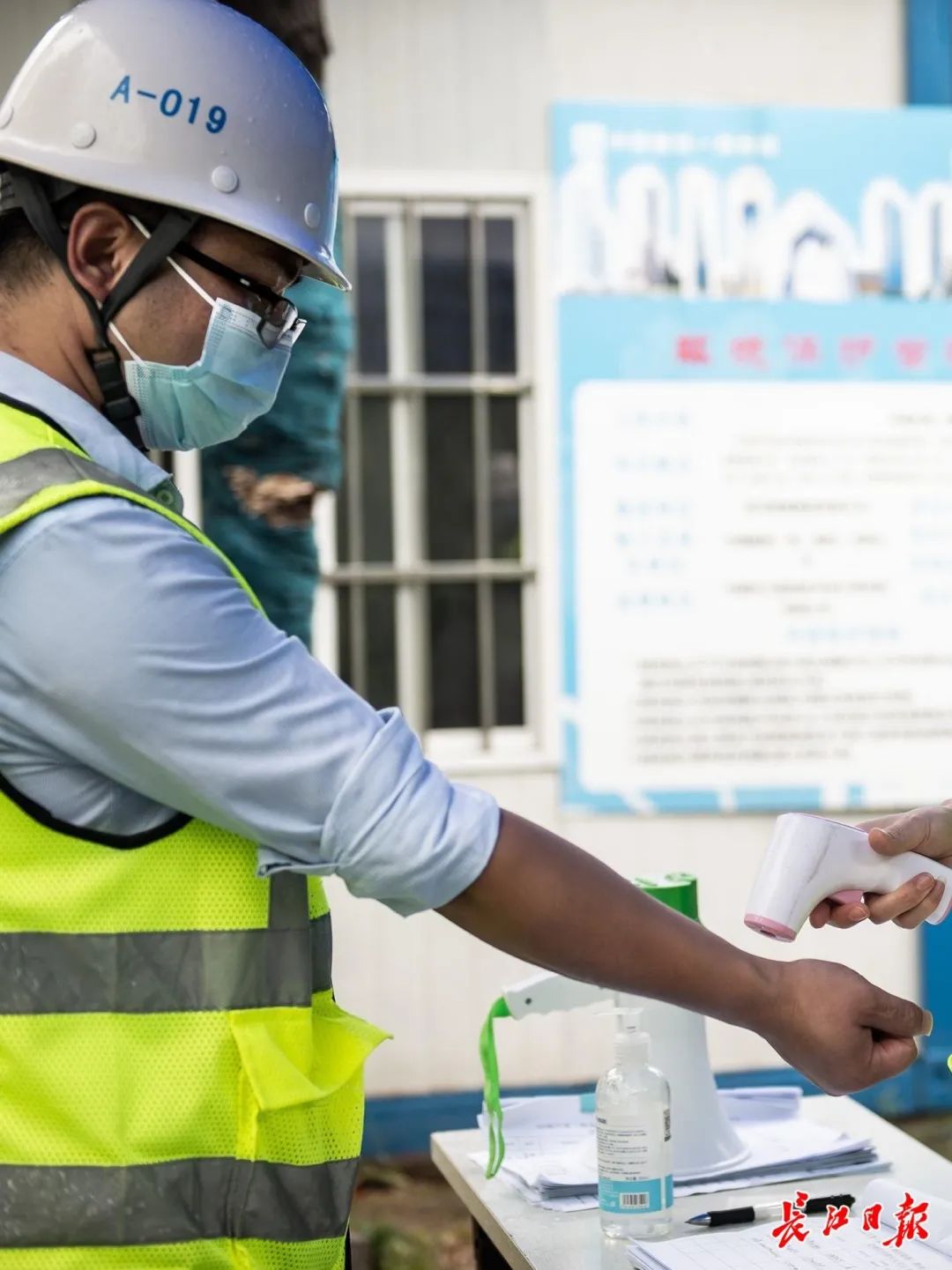 步行5分钟,从宿舍到达施工现场,王鑫盯着每名工人扫码、测温、手部消毒再进场,中途他和林茂还要时刻注意工人师傅有没有规范佩戴口罩。晚上回到宿舍,王鑫还不能休息,他必须要清查班组人数,晚上确保没有人员外出,检查房间的消毒记录。