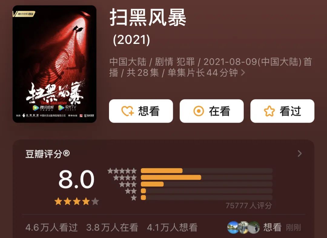 这部改编自孙小果案、操场埋尸案、湖南文烈宏涉黑案等真实案件的扫黑剧,由中央政法委秘书长、全国扫黑办主任陈一新出任总顾问,孙红雷、刘奕君、王志飞、宁理等实力演员加盟,首播6小时网络播放量破亿,豆瓣开分8.0。