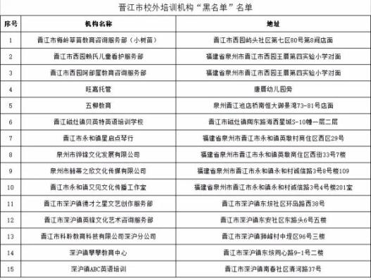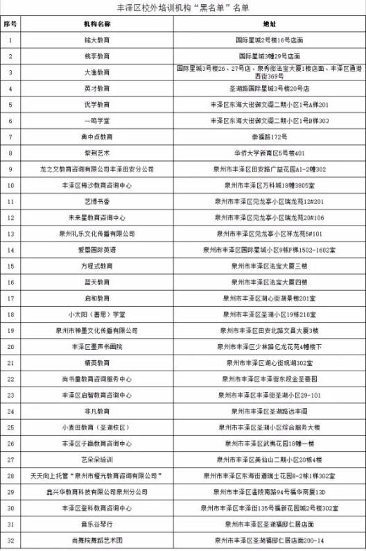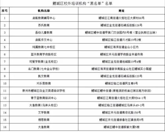 为落实“双减”要求,进一步规范泉州市校外培训机构办学行为,日前,泉州市教育局更新了各县(市、区)校外培训机构黑名单,并公布举报电话,全面接受社会监督。目前,全市列入黑名单的校外培训机构共计161家。黑名单为有重大安全隐患的、有严重违规办学行为或达不到办学条件的校外培训机构。