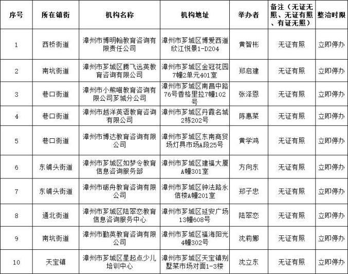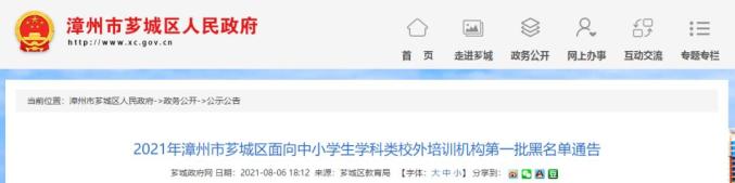 据漳州市芗城区人民政府网站消息,8月6日,芗城区教育局发布2021年漳州市芗城区面向中小学生学科类校外培训机构第一批黑名单通告。
