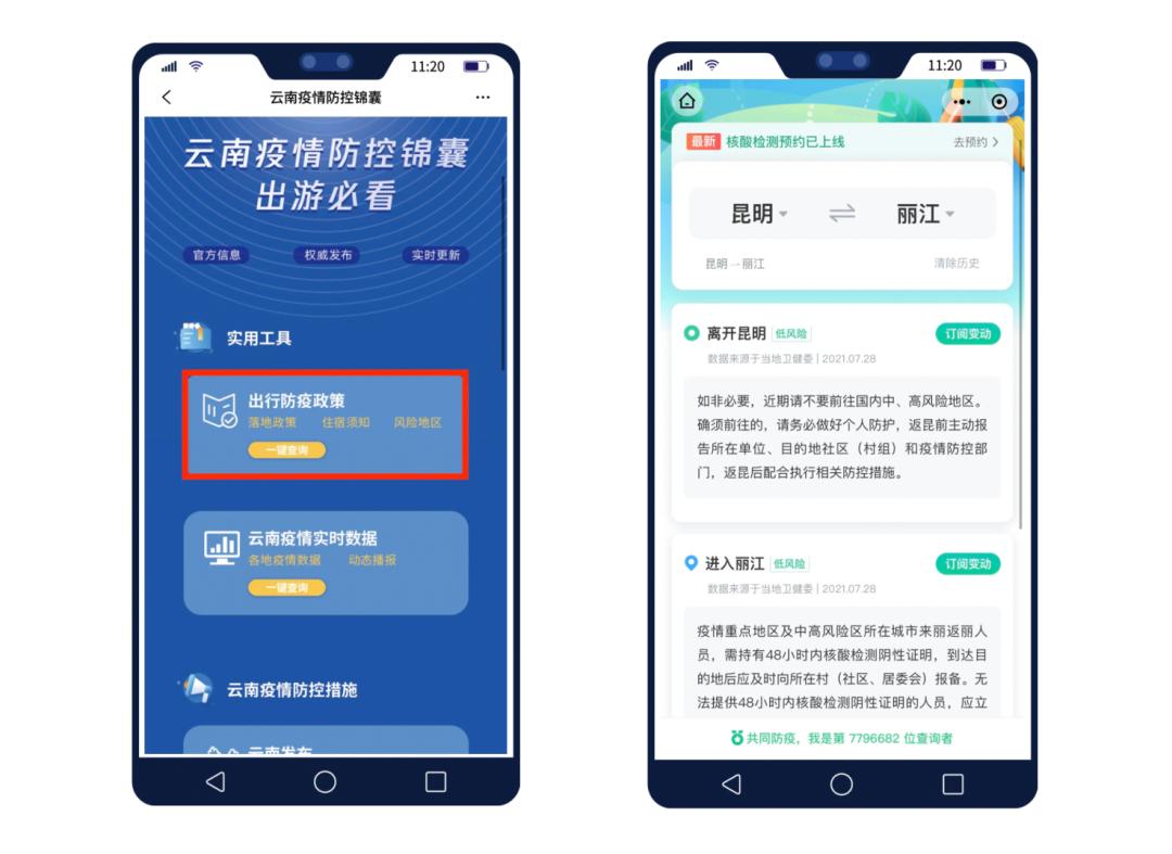在“实用工具”板块,提供“出行防疫政策”及“云南疫情实时数据”查询服务。这两项服务与“腾讯出行服务”及“腾讯健康”小程序打通数据接口,实现一键跳转查询。