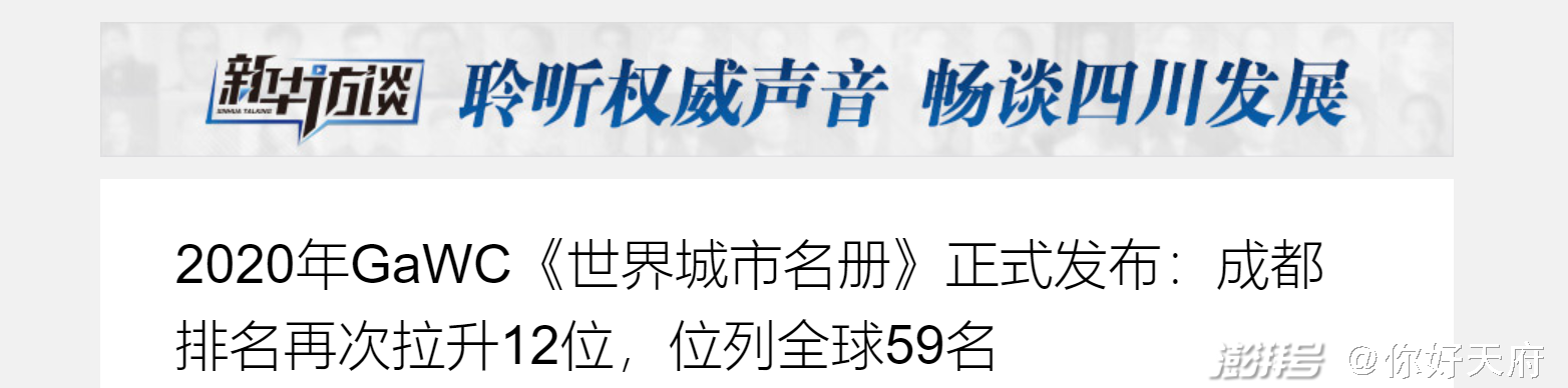 2020年8月21日,由全球化与世界城市(GaWC)研究网络编制的全球城市分级排名——《世界城市名册2020》正式出炉,最新的世界排名看在本次Beta+的榜单中,成都作为唯一中国城市入选,相较于2018年再次提升12位,位列全球第59名。短短两年,排名开挂上升,国际认可呼声持续不断。
