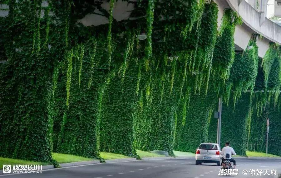 从二环高架桥下穿过,就好似步入一个由绿色组成的迷宫,爬山虎占据着整个桥墩。于成都人民来说二环高架里的绿意就是一场盛大的“视觉盛宴”,带来夏日清快。